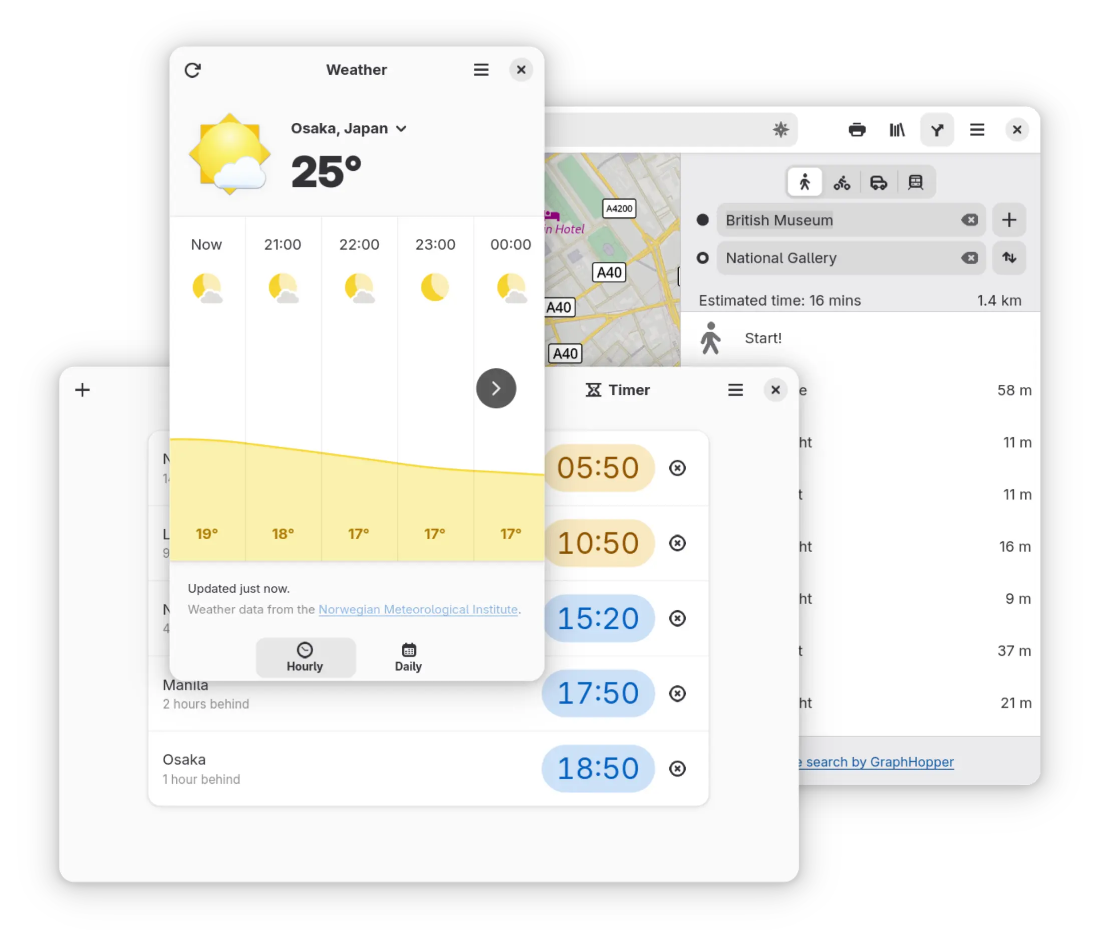 Fedora Workstation bevat een handige verzameling van nuttigheden, zoals Clocks, Weather and Maps.